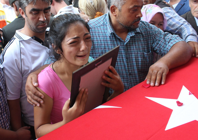 Sözleşmeli Onbaşı Fatih Duru’nun annesi Azime Duru, ’Oğlum hakkını helal et, Milletimiz vatanımız sağ olsun’’ dedi. İki gün önce Dağlıca ’da, PKK’lı teröristlerin yola döşedikleri mayınları, zırhlı araçların geçişi sırasında patlamaları ile şehit düşen Onbaşı Fatih Duru Çanakkale’nin Kayacık köyünde binlerce vatandaşın katıldığı törenle son yolculuğuna uğurlandı. Kahraman şehidimiz, Fatih Duru’nun cenazesi hava yoluyla Çanakkale’ye getirildi. Hava alanında binlerce Çanakkale ’linin karşıladığı şehit Duru, Çanakkale askeri hastanesine kortej eşliğinde getirildi. Daha sonra şehidimizin naaşı, Ezine’nin Kayacık köyünde baba ocağına getirildi. Cenazede, 100 araçlık konvoy oluşurken motosikletliler de şehidimizi yalnız bırakmadı. Anne Azime Duru, ‘Oğlum bize hakkını helal et. Vatan sağ olsun’’ diyerek tabutun başındaki resmine sarılarak gözyaşları döktü. Cenazeye, Çanakkale Valisi Hamza Erkal, siyasiler, askerler ve binlerce vatandaş katıldı. Şehidimizin naaşı tekbirlerle Kayacık köyünde, toprağa verildi. |