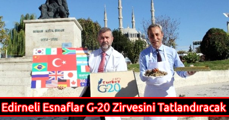 Edirne’yi tanıtmak için çok güzel bir fırsat olduğunu belirten Tava Ciğeri Koruma Derneği Başkanı Bahri Dinar, gazetecilere yaptığı açıklamalarda G20 zirvesine katılan liderlere Edirne’nin meşhur yöresel lezzetlerini sunmak istediklerini belirtti. Edirne’li ciğerciler ve şekerlemeciler tüm hazırlıklarını yaparak, G0 zirvesinde tava ciğerini, badem ezmesini, Kavala kurabiyesini ve deva-i misk helvası gibi eşsiz tatları sunmak için davet beklemekteler dedi. Başkan Dinar, G20 zirvesinin Edirne için bulunmaz bir fırsat olduğunu, zirveye davet edilmemeleri durumunda da bu lezzetlerden oluşacak paketleri liderlerin kaldığı otele göndereceklerini belirtti.