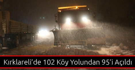 Tüm yurtta olumsuz hava koşullarının hüküm sürmesi ile birçok köy yolu da ulaşıma kapandı. Kırklareli’de de yoğun kar yağışı nedeni ile, 102 köy yolu ulaşıma kapandı. Kar ve tipi nedeniyle ile kapanan köy yollarının 95’i ulaşıma açılırken 7 köy yolunu açma çalışmaları devam ediyor.