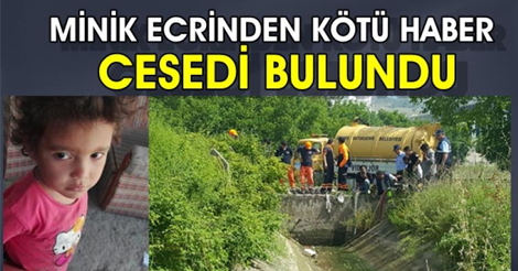 3 yaşındaki Ecrin Sakarya Pamukova ilçesinde Yenice Mahallesi’nde evinin önünden kaybolmuştu. Küçük kızın cansız bedeni, Turgutlu Mahallesi’nde DSİ’nin sulama kanalının dışarısında bulunan toprak kanalda bulundu.