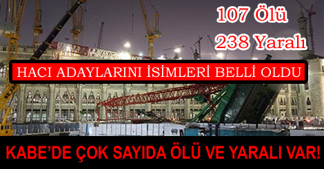 Kabe’de devrilen vinç 107 kişinin ölümüne yol açarken 238 kişi de yaralanarak hastanelerde tedavi altına alındı. Diyanet İşleri Başkanı Mehmet Görmez, Kabe’de meydana gelen vinç kazasında 2 Türk’ün de bulunduğunu aktardı. Kabe’de hava şartlarının birkaç gündür ağırlaştığını oluşan yağmur ve fırtına yüzünden Mescid-i Haram’da yapılan genişletme faaliyetleri sırasında 50-55 metre uzunluğundaki vincin hacı adaylarının üzerlerine kontrol edilemeyerek düştüğü bildirildi. Başkan Mehmet Görmez, Kabe’de vincin devrilmesi sonucunda iki Türk hacı adayının da olduğunu belirtirken, 19 Türk’ün de yaralandığı bilgileri verildi. Yaralı hacı adaylarından 13 tanesi kendi hastanemizde tedavi altına alınırken, hayati tehlikeleri olmadığı açıklandı. Yalnız 6 hacı adayıonın Suudi Arabistan’da başka hastanelere nakledildiği, bu vatandaşlarımızın da hayati tehlikelerinin olmadığı açıklandı. Görmez kazada hayatını kaybeden hacı adaylarının isimlerini açıkladı. Buna göre, Trabzon’dan Erol Karaağaçlı ve İstanbul’dan Abdülkadir Gökmen yaşamlarını yitirdi. Kabe’deki kazada yaralanan vatandaşlarımızın isimleri de şöyle; ‘’Hasan Apaydın, Safiye Yıldız, Feride Karaağaçlı, Mehmet Ali Ünal, Zeki Erdem, Habip Barlalı, Mehmet Türkmen, Abdullah Üresin, Abdülgazi Savaş, Yusuf Emsal, Cennet Kavas, Refiye Üret, İrfan Okullu, Hasan Yoldaş, Mustafa Boz, Hüssam Vahid’’ Cumhurbaşkanı Erdoğan’da, Kral Selman Bin Abdülaziz Al Suud’u arayarak üzüntülerini bildirdi. |