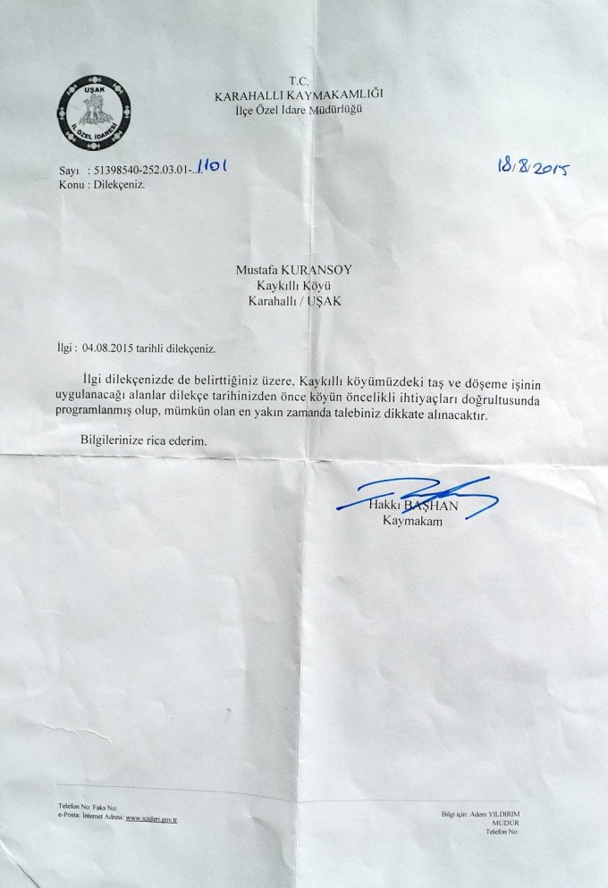 Ancak Mustafa Kuransoy’un akülü engelli sandalye sevinci fazla sürmedi. Çünkü oturduğu evin sokağı akülü aracın kullanılmasına müsait değildi. Köyün birçok yolu parke taşı ve asfalt olmasına rağmen felçli vatandaşın 200 metre uzunluğunda olan sokağında bir çalışma yapılmadı. Yaklaşık 2 yıldır köy muhtarı, Kaymakamlık ve Uşak Valiliğine kadar 200 metre olan sokak yollunun düzeltilmesi için başvuruda bulunan Kuransoy’un talebi her defasında köyün öncelikli işlerinin olduğu ve yol yapım programının başvuru dilekçesinden önce yapıldığı söylenerek ileri bir tarihe ertelendi. Felçli vatandaş son olarak 2 ay önce Karahallı Kaymakamlığı’na verdiği dilekçeden de olumsuz yanıt alınca tüm ümitlerini tüketip yaşadığı hapis hayatından kurtulabilmek için Başbakan’dan yardım istedi.