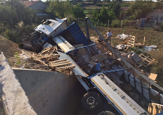 Tekirdağ - Malkara D-100 Karayolunda yaşanan kaza, sürücünin direksiyon hakimiyetini kaybetmesi ile Haliç Mahallesi girişisindeki köprü üzerinden dereye uçtu sürücü kendi çabası ile hafif sıyrıklarla tırdan çıktı.