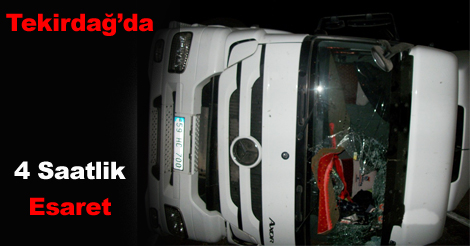 Hayrabolu-Malkara karayolunda tır sürücüsü, direksiyon hakimiyetini kaybetti. Tır, Malkara-Hayrabolu yolunun ortasında devrildi. İki şeritli karayolunda trafik tamamen durdu. Sürücülerin ve yolcuların esareti 4 saat sürdü.